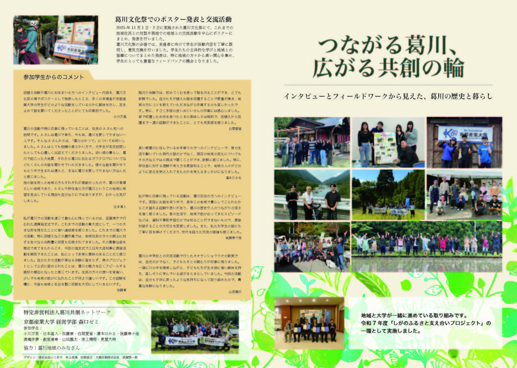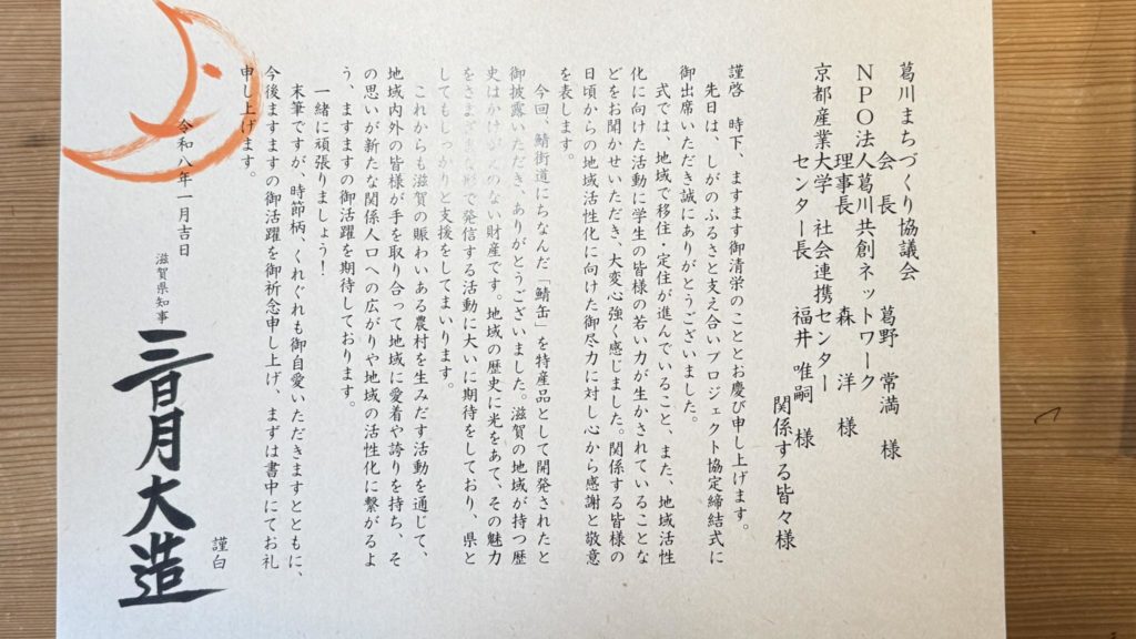 2026年1月16日、滋賀県庁にて「葛川まちづくり協議会」「京都産業大学」「滋賀県」そして私たち NPO法人葛川共創ネットワーク の4者による協定調印式が執り行われました。 本協定は、「しがのふるさと支え合いプロジェクト」の一環として締結されたもので… -
