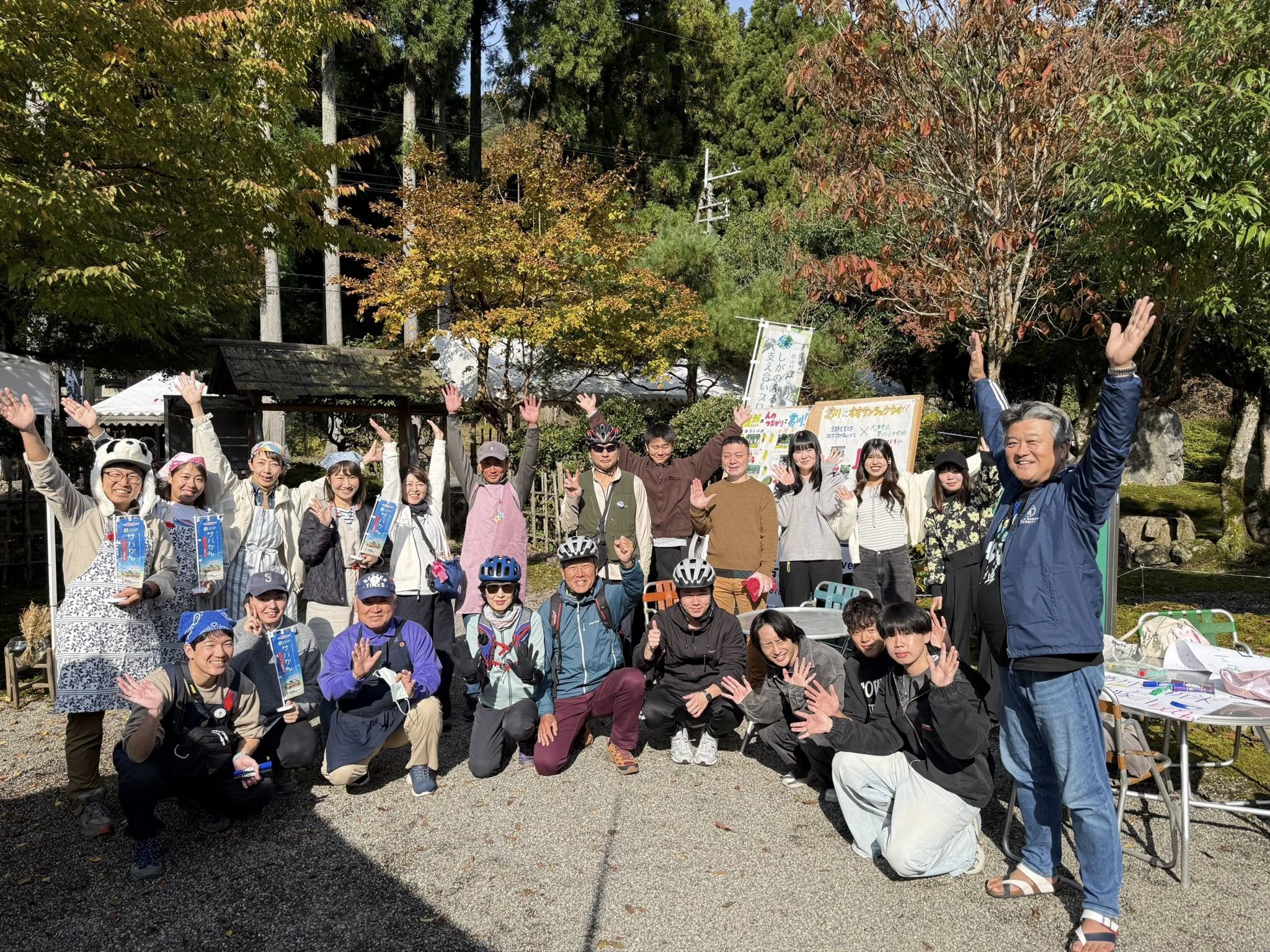 葛川を出発する際は、葛川の文化祭で模擬店を出してるnpoメンバーと京都産業大学の学生諸君に応援、見送っていただきました❣️
